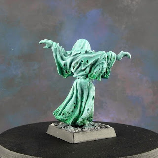 Stary duch, jeden ze świetnej linii figurek z lat osiemdziesiątych, zgrupowanych pod nazwą Night Horrors. Od wielu lat miałem go pomalowanego wraz z innymi duchami z tego okresu, posadowionego na wspólnej podstawce, wymaganej przez przepisy gry. Po pomalowaniu nowych duchów zdecydowałem jednak, że stare figurki zasługują zarówno na lepsze malowanie, jak i podstawki, które pozwolą pokazać je pojedynczo. I tak duszek trafił do rozpuszczalnika, a potem na nową podstawkę, która pozwoli mi używać go choćby we "Frostgrave".